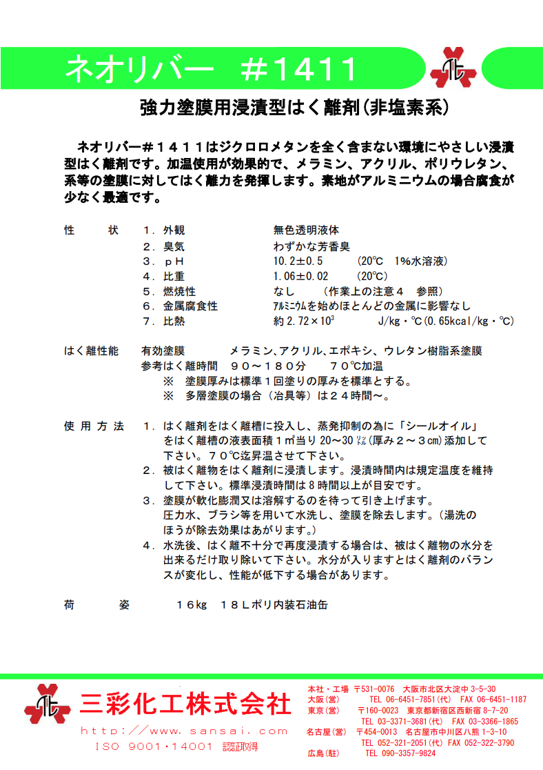 ネオリバー#1411はジクロロメタンを全く含まない環境にやさしい浸漬