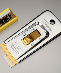 タイルやガラス、壁、床といった滑らかな表面から塗料や接着剤などの付着物を落とすのに使う手作業工具です。