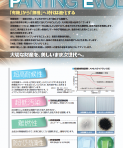●超低汚染タイプの超高耐候性水性2液形エポキシ変性アクリルシリコン樹脂系無機塗料です。