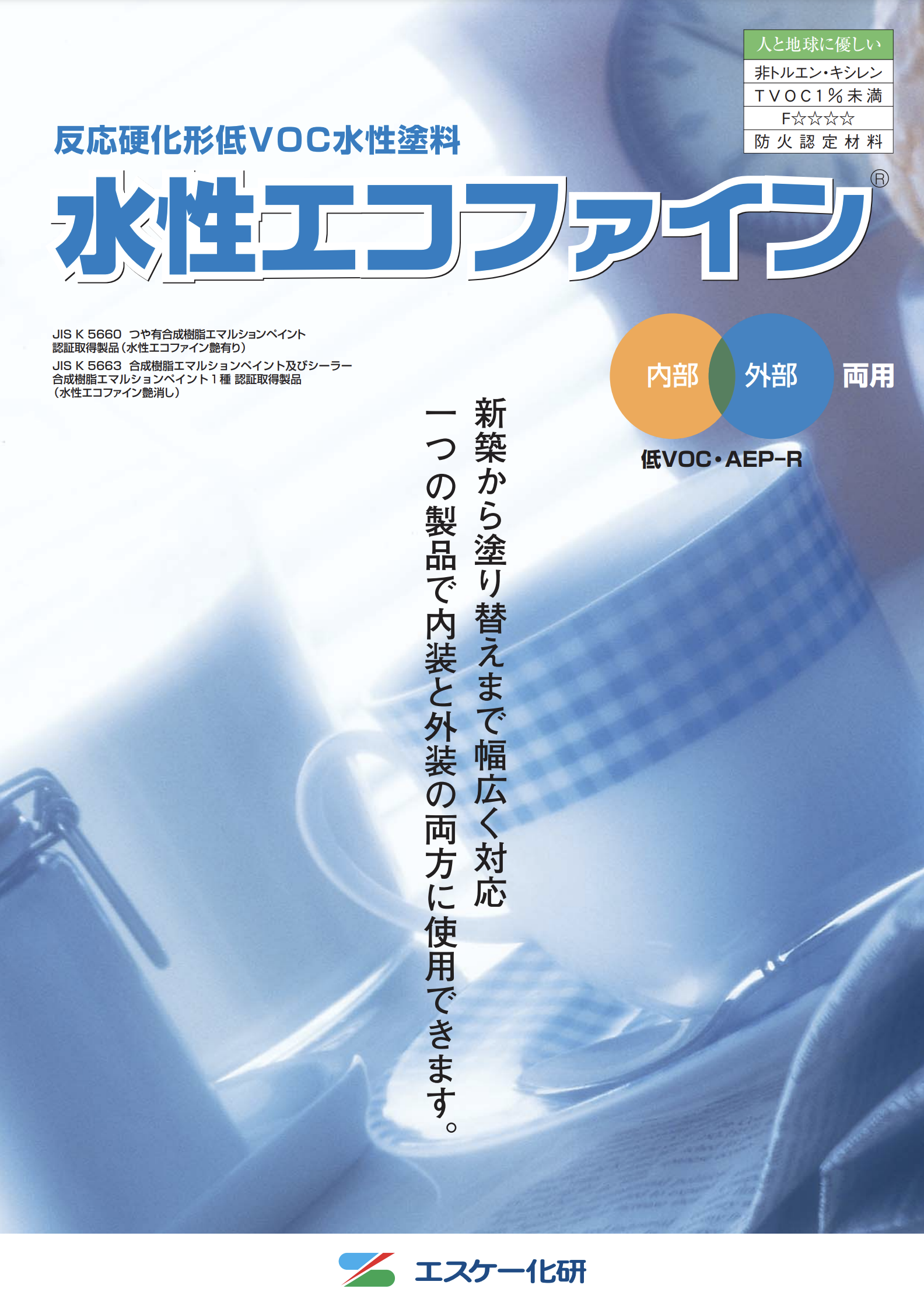 | 適用下地 | ・コンクリート、セメントモルタル、スレート板、せっこうボード、各種旧塗膜等 ・鉄部(建築物内部及び非雨掛かりの外部)※ ※錆止め塗料として、水性エポサビアンダーをご使用ください ※水性エコファイン艶消しは適用できません |