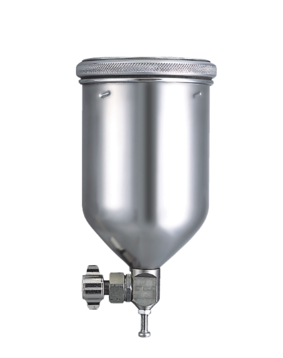 容量450㎖で小形スプレーガンでの塗装に最適です。金属製カップで初のパッキンレスのワンタッチロック式カップです。