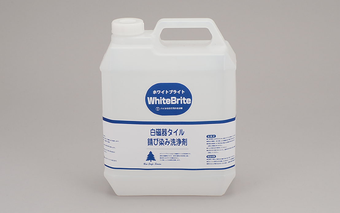 ホワイトブライトは主に白磁器タイル洗浄剤です。液性は弱酸性ですが、従来の酸性の洗浄液と違い基本的にはガラスを傷めません。錆び落としにも効果を発揮します。
