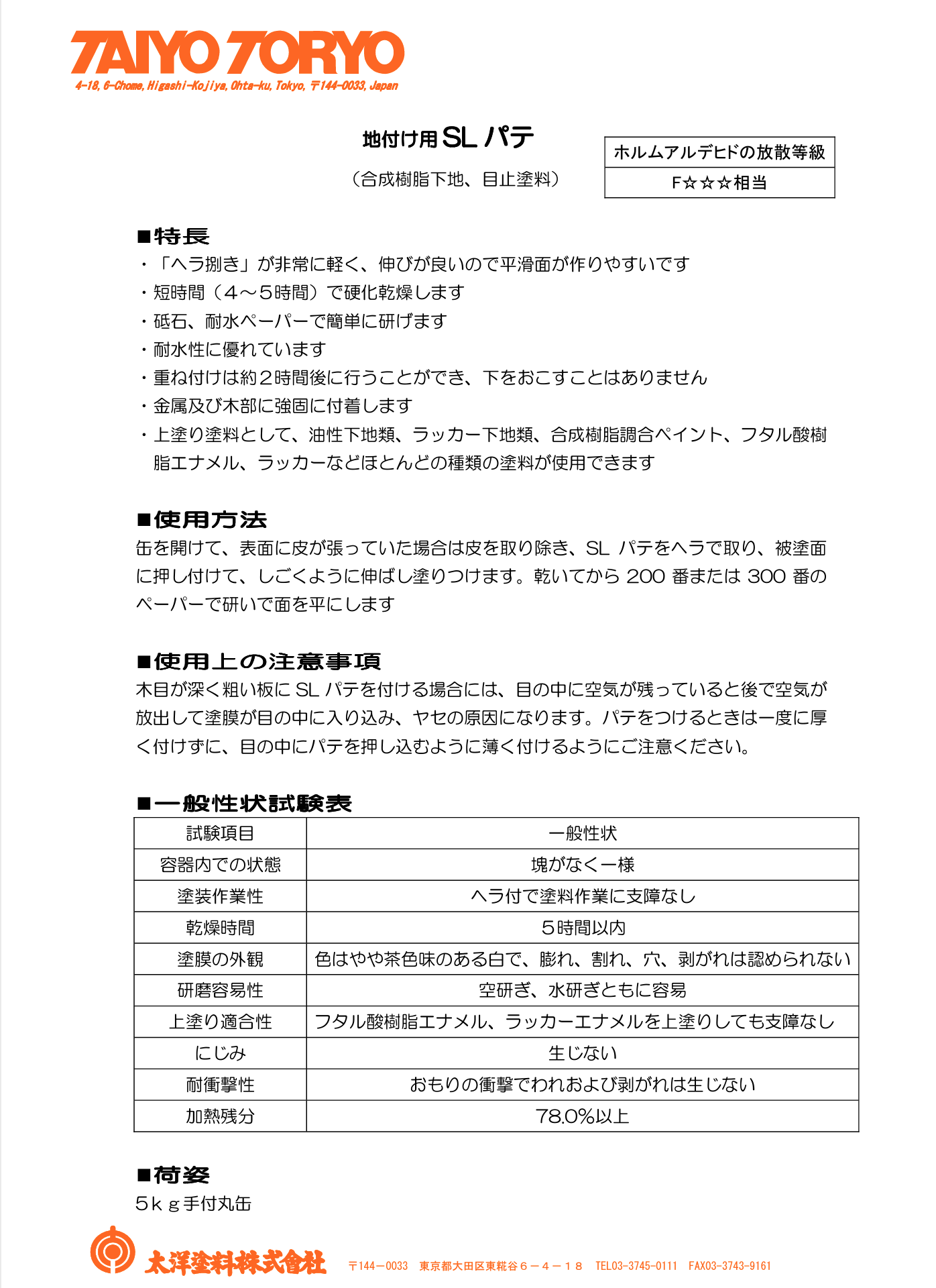 SLパテ 白 5KG #太洋塗料 #合成樹脂下地、目止塗料 # 上塗り塗料として、油性下地類、ラッカー下地類、合成樹脂調合ペイント、フタル酸樹脂エナメル、ラッカーなどほとんどの種類の塗料が使用できます #太洋塗料