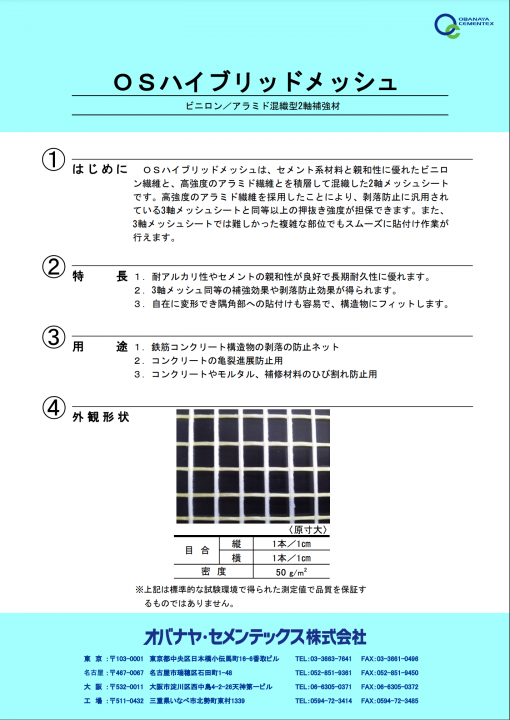 OSハイブリッドメッシュは、セメント系材料と親和性に優れたビニロ ン繊維と、高強度のアラミド繊維とを積層して混織した2軸メッシュシート です。高強度のアラミド繊維を採用したことにより、剥落防止に汎用され ている3軸メッシュシートと同等以上の押抜き強度が担保できます。また、 3軸メッシュシートでは難しかった複雑な部位でもスムーズに貼付け作業が 行えます。