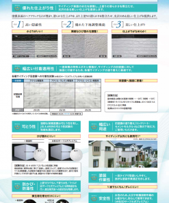 | 適用下地 | 窯業系サイディング 、コンクリート・セメントモルタル・ALC等 (光触媒や親水性タイプの表面コーティングあるいは無機コーティング材が塗装されているサイディングには適用できません。) |