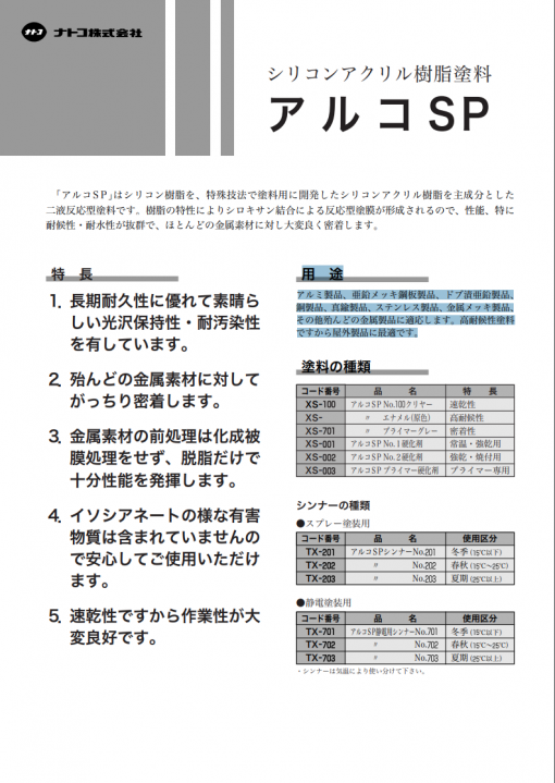 「アルコSP」はシリコン樹脂を、特殊技法で塗料用に開発したシリコンアクリル樹脂を主成分とした 二液反応型塗料です。樹脂の特性によりシロキサン結合による反応型塗膜が形成されるので、性能、特に 耐候性・耐水性が抜群で、ほとんどの金属素材に対し大変良く密着します。