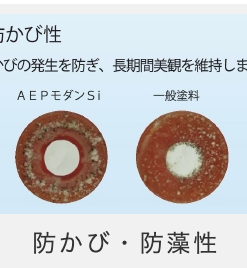 ●強力防かび・防藻 抗菌剤配合 内装用汚染除去性アクリルシリコンエマルション系塗料(EP-Si)です。 ●JIS K 5663 合成樹脂エマルションペイント 1種 ※相当品(社内試験による)です。 ●「つや消し」仕上げです。 ●反応硬化形の緻密な塗膜が、汚れの付着を防ぐ低汚染タイプです。汚れた場合も、内部に浸透しませんので、中性洗剤で簡単に拭きとることができます。 ●AEPモダンSiに防かび剤・防藻剤を配合した強力防かび・防藻タイプです。 ●集合住宅・学校・病院・商業ビルなどの内部の塗替えに最適です。
