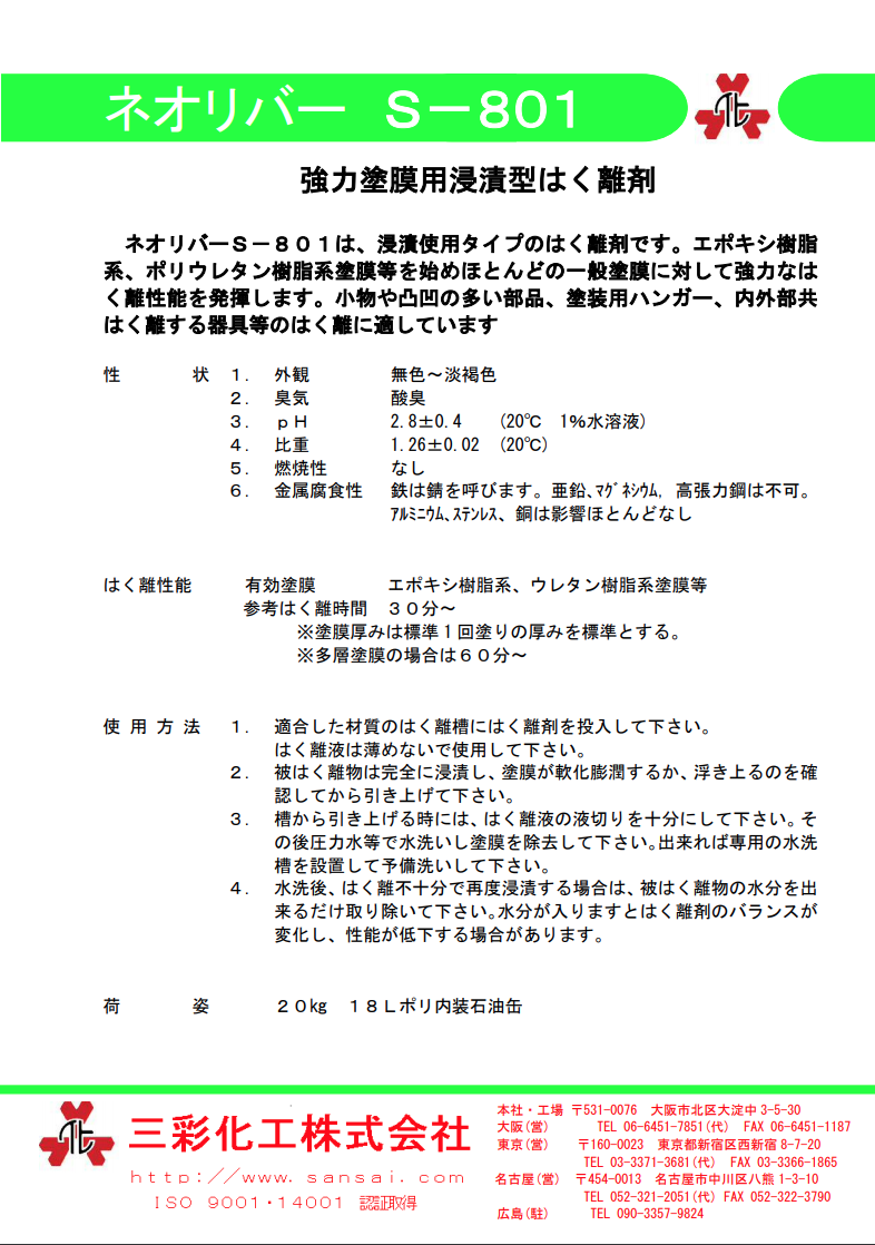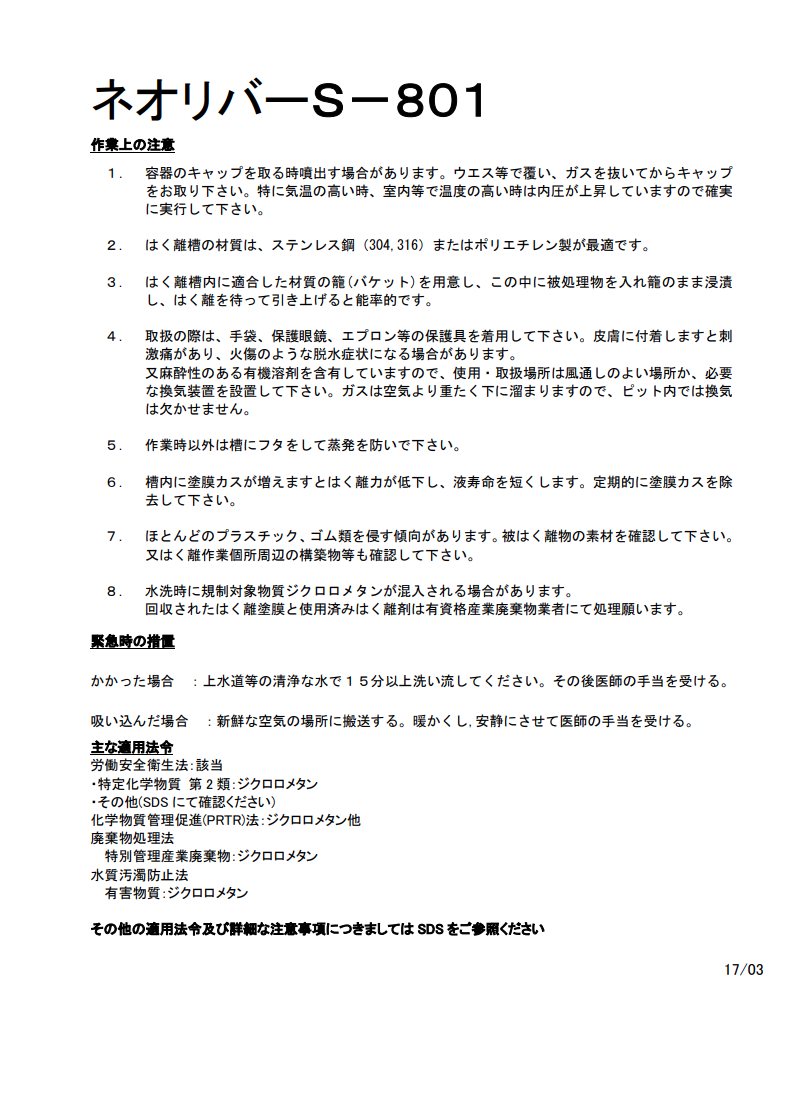 ネオリバーS−801は、浸漬使用タイプのはく離剤です。エポキシ樹脂系、ポリウレタン樹脂系塗膜等を始めほとんどの一般塗膜に対して強力なはく離性能を発揮します。小物や凸凹の多い部品、塗装用ハンガー、内外部共はく離する器具等のはく離に適しています