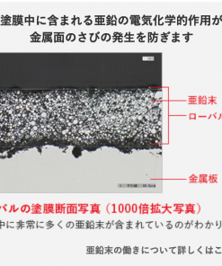 ローバルは乾燥塗膜中の亜鉛含有率を96%にまで高めることで、溶融亜鉛めっきと同等の防錆力を発揮します。また、常温で場所を問わずに施工できることから、高温で加工処理する溶融亜鉛めっき(Hot Dip Galvanizing)に対し、「常温亜鉛めっき」(Cold Galvanizing)と呼ばれています。