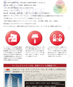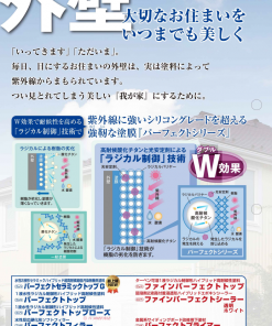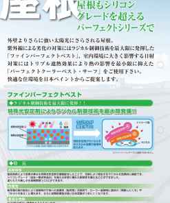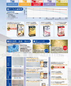| 適用下地 | (下塗り:パーフェクトフィラー、パーフェクトサーフの場合) モルタル面、窯業系サイディングボード、コンクリート面、ALCパネル面の各種旧塗膜 (下塗り:パーフェクトプライマーの場合) 鉄部、FRP、ステンレス、金属系サイディングボード、亜鉛メッキ、アルミ、木部 |