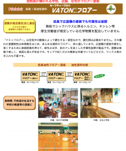 「バトンフロアー」は空気中の酸素によって硬化する一液型なので、硬化剤は必要ありません。その優れた塗膜物性は体育館をはじめ、あらゆる場所のフロアー、床に適しています。広面積の塗装作業をし易くするために表面乾燥を押えて、刷毛さばき、肌のナレを良くした作業性抜群の製品です。塗膜は強靱で美しく、表面も滑らず安全です。モップで拭くだけの簡単な作業でいつもピカピカ、ワックス等の手入れも不要です。
