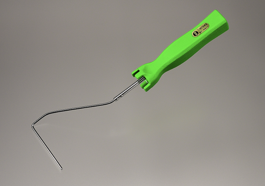 ミニローラー専用ハンドル。ミニローラーは普通のローラーに比べ筒の部分が細いため専用のハンドルでないと使えません。しかしこのローラーが非常に使える商品であります。外装では従来刷毛で塗ったチリ部分をこのローラーで塗ると非常に効率がよく仕事ができると好評です。その他に通常ローラーで入らない細い部分を塗るときはこれに限ります。