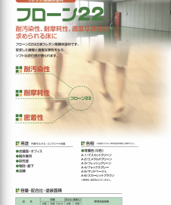 フローン22は、優れた性能と作業性の良さで、高い評価を得ております。自在な塗厚膜が可能で、安定した硬度と適度な弾性をもち耐汚染性、耐摩耗性、密着性などに際立った性能を発揮します。建築物の機能配色に沿う、常備色6色をはじめ、美しく、清潔で、快適な床を実現します。